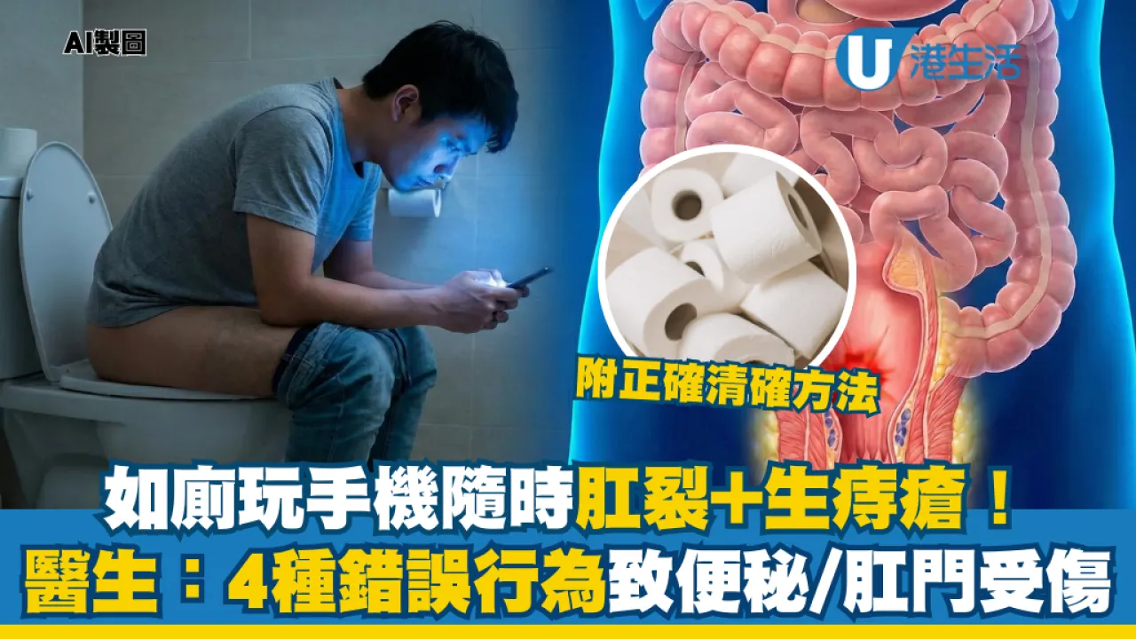 大便|痔瘡|腹脹|你是不是習慣帶著手機進廁所,一坐就 20 分鐘?這看似是排便時的娛樂消遣,長遠竟是造成痔瘡、裂傷的元兇!黃軒醫生警告,坐馬桶玩手機超過 10 分鐘,會令肛門血管長期處於高壓狀態。另外,如廁太用力反而會傷及骨盆底;甚至擦屁股方向唔啱,都會親手將細菌帶入尿道引發感染!即睇醫生拆解 4 大錯誤排便行為,教你正確排便學問!