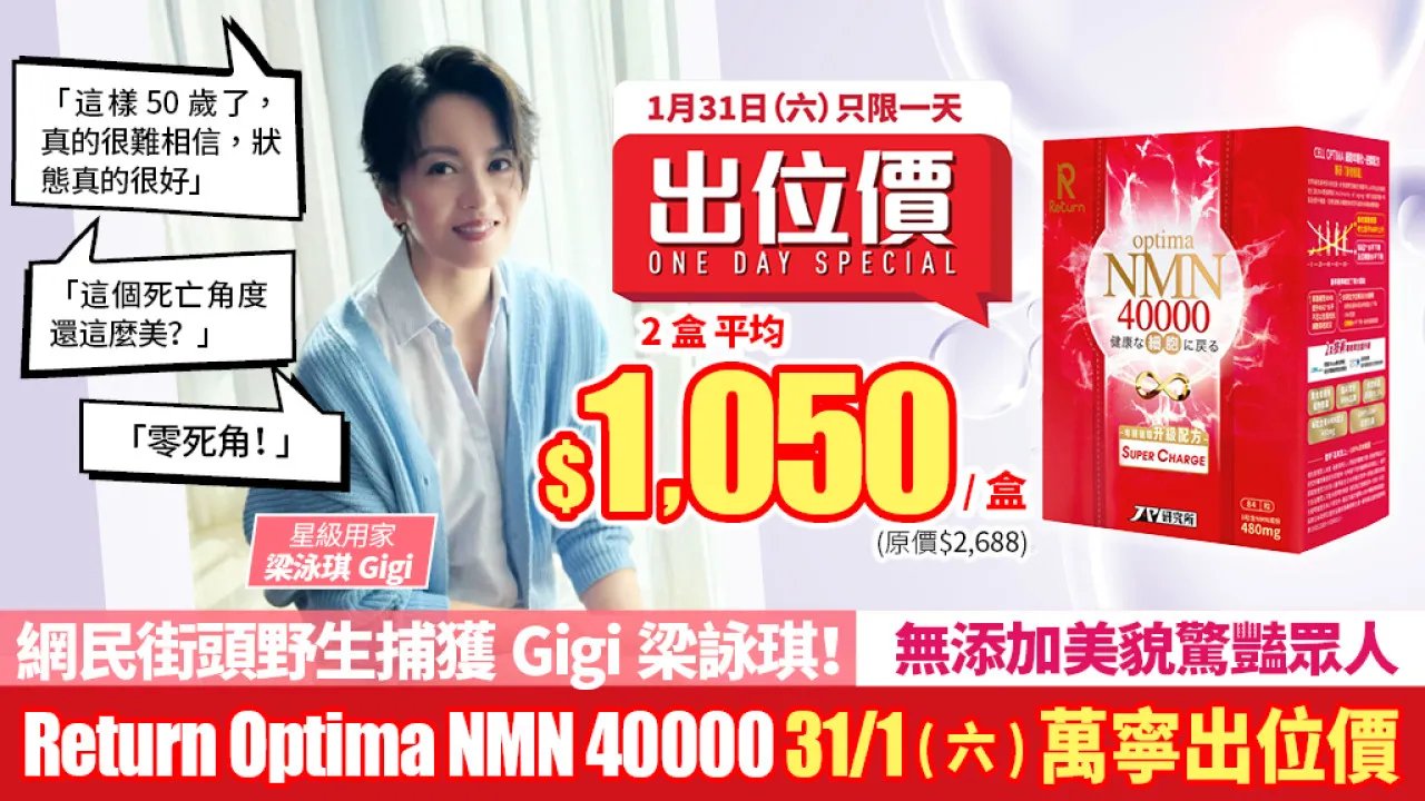 點解Gigi梁詠琪可以Keep得咁好?原來要真正逆轉衰老,唔可以只靠外在護理,必須針對體內細胞嘅「衰老根源」!隨著年齡增長,人體內嘅NAD+水平會下降,導致細胞能量不足、自我修復能力減弱,呢個就係衰老嘅關鍵原因。而補充NMN就係目前最快最安全提升NAD+水平嘅方法!凍齡女神Gigi就揀咗 Return Optima NMN 40000,幫你由細胞層面開始逆齡!留意 ~ 1月31日(星期六)萬寧出位價 買2盒平均$1,050/盒,單盒$1,200(原價$2,688) ,只限一日 記得搶購!!!!