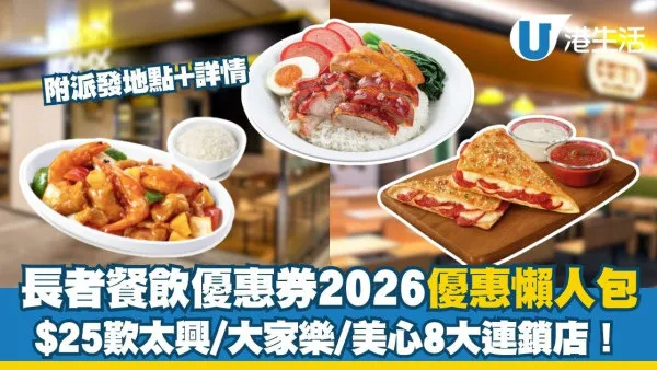 長者餐飲優惠券2026︱政府於2026年2月20日起推出第四輪「長者餐飲優惠券」計劃,聯同大家樂、大快活及太興等8大連鎖品牌,為全港7萬名合資格老友記提供餐飲優惠。合資格長者可透過全港200間長者中心派發點領取優惠券,以每餐低至$25的超值價格享用經典港式燒味、家常小菜及西式快餐。