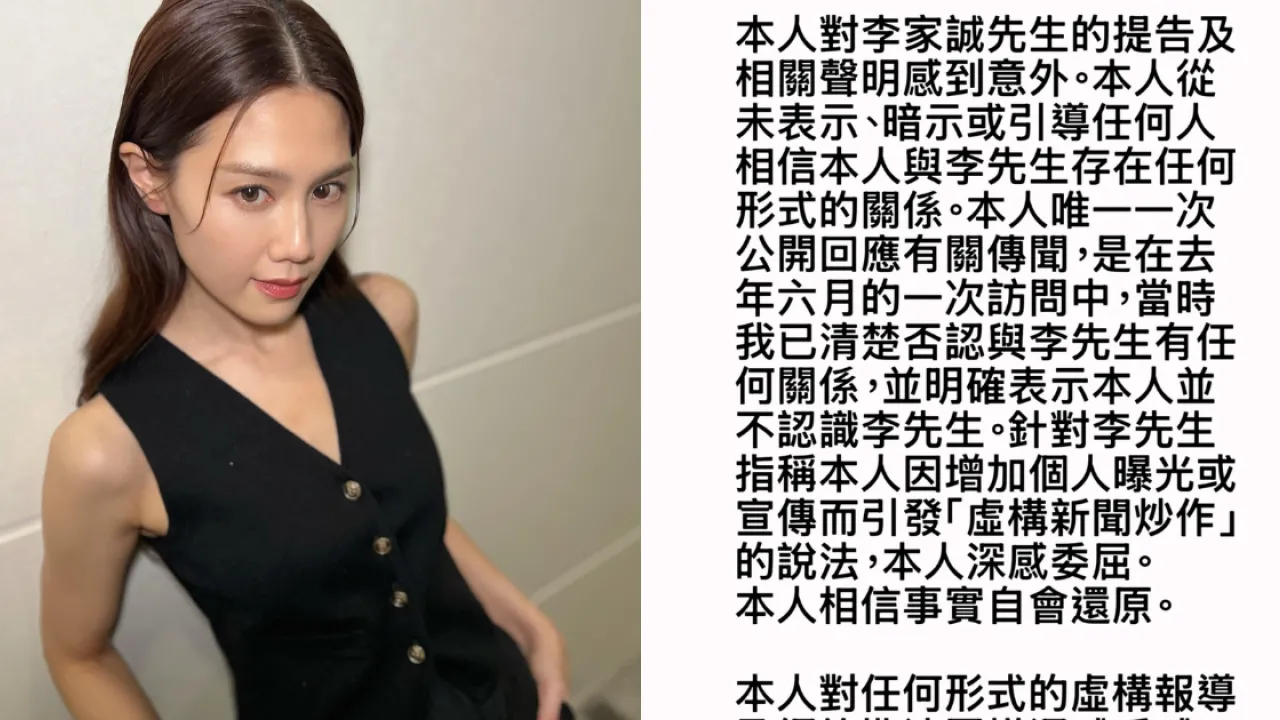 本人對李家誠先生的提告及相關聲明感到意外。本人從未表示、暗示或引導任何人相信本人與李先生存在任何形式的關係。本人唯一一次公開回應有關傳聞,是在去年六月的一次訪問中,當時我已清楚否認與李先生有任何關係,並明確表示本人並不認識李先生。針對李先生指稱本人因增加個人曝光或宣傳而引發「虛構新聞炒作」的說法,本人深感委屈。本人相信事實自會還原。