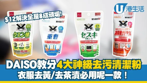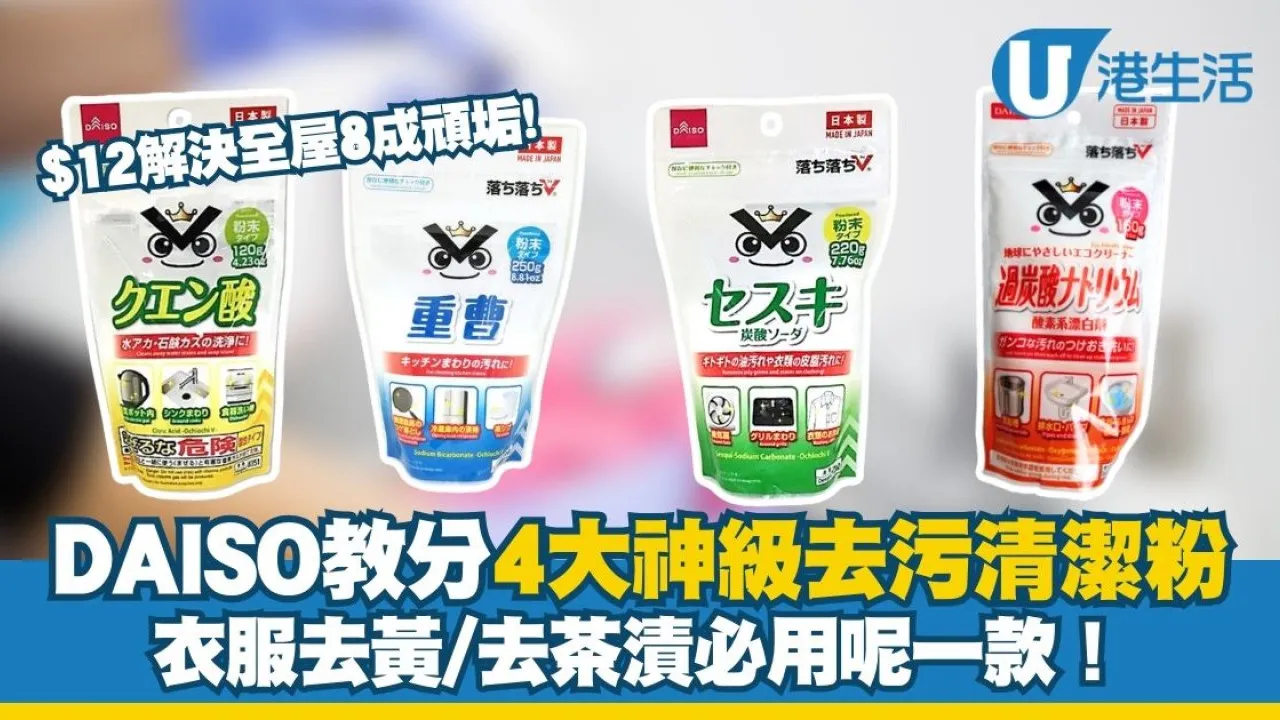 日本DAISO的清潔劑粉末主要分為檸檬酸、小蘇打(重曹)、倍半碳酸鈉及過碳酸鈉四類,各有不同的去污功效。
