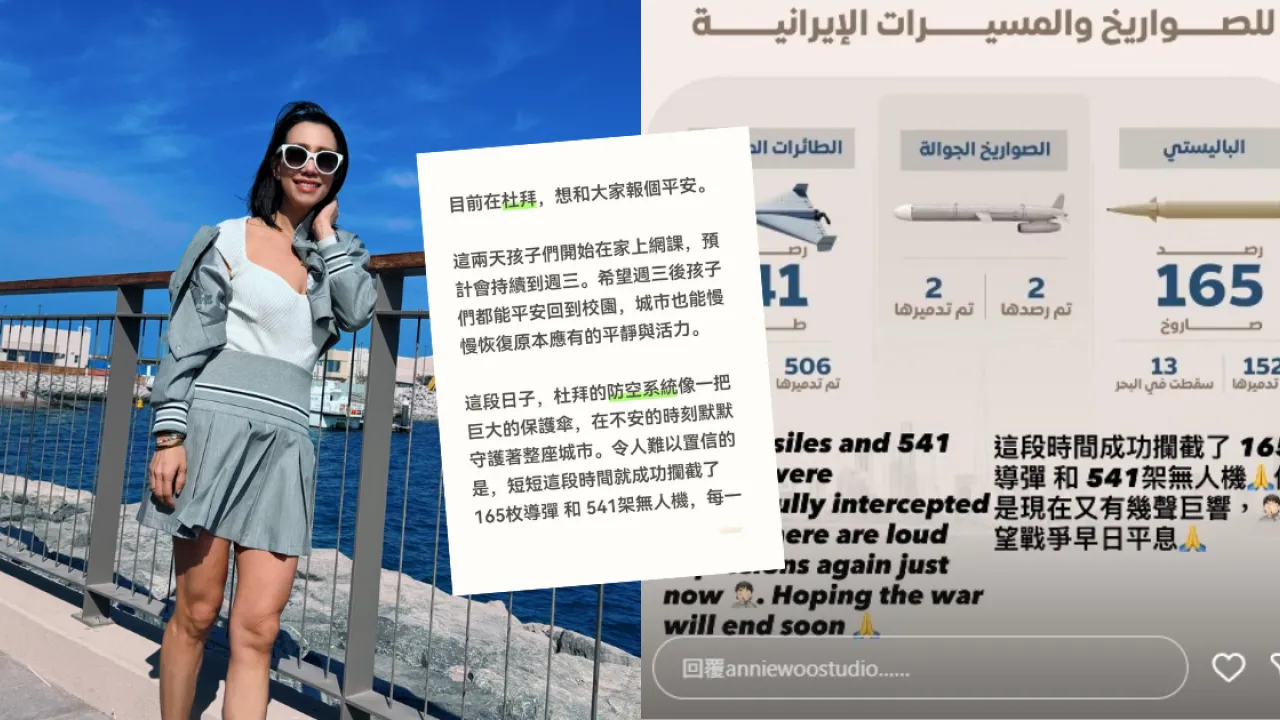 現年47歲的台灣女星吳辰君(Annie),早年憑成龍經典電影《警察故事4之簡單任務》出道,自2012年結婚後她便逐漸淡出幕前,大約三年前更與丈夫及一對子女移居杜拜。隨着近期美國、以色列與伊朗的中東衝突持續升溫,杜拜日前亦遭受戰火波及。吳辰君事後在社交平台發文向大眾報平安,並親身講述經歷導彈攔截的驚悚瞬間,坦言在震耳欲聾的爆炸聲中,深刻體會到平凡生活的極度可貴。