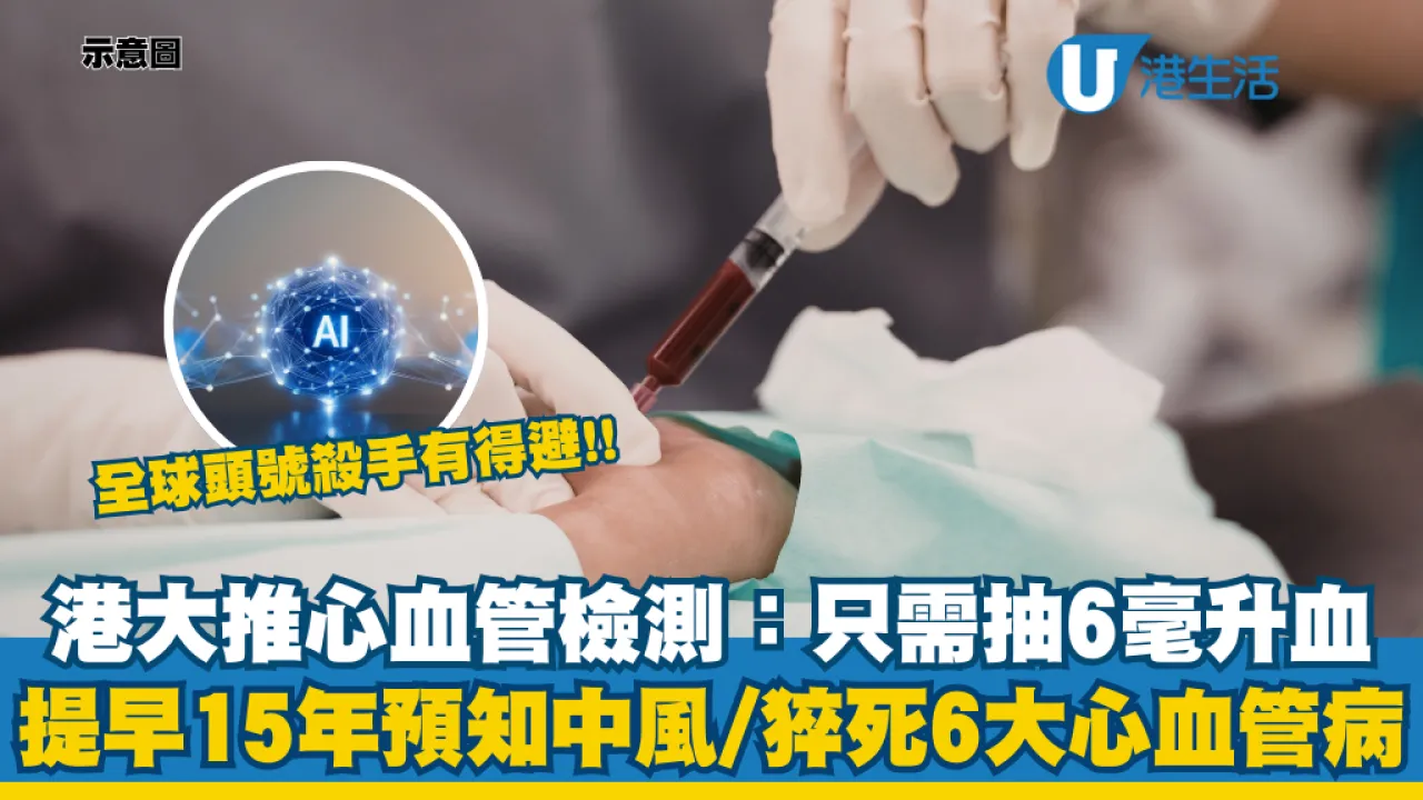 心血管疾病是全球「頭號殺手」,很多時發生得無聲無息。港大醫學院近日帶來震撼喜訊,研究團隊研發一套創新的心血管疾病風險預測框架,只需要抽 6 毫升血,就可以精準捕捉你體內隱匿的病變訊號!這套工具可精準預測未來可能會罹患6種主要心血管疾病的風險,甚至可以在發病15年前就發出預警,只抽一次血,加上不用做大量的身體檢查就能為自己做好預防工作。即看下文了解這AI工具能測出甚麼疾病!
