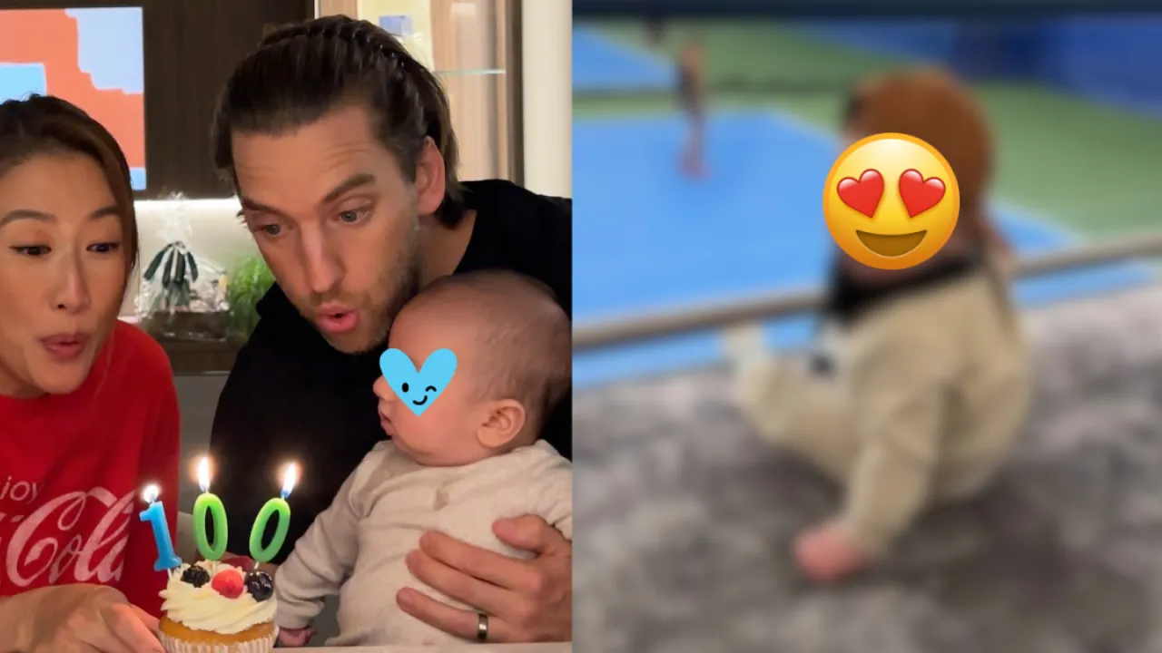 期間舉起手仔似為媽媽打氣,最後轉身對着爸爸方向的鏡頭甜笑,曝光神秘樣貌。雖然只得7個月大,不過亦可以看得出二人的愛情結晶,完美地遺傳了父母的好基因,擁有一雙水汪汪的大眼睛,鼻子高挺,嘴巴小巧,混血靚仔樣十分可愛!