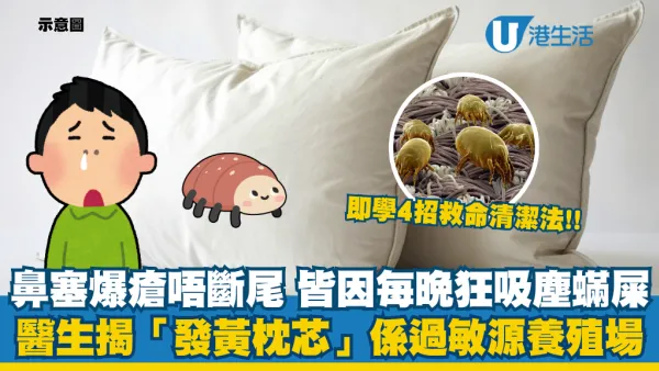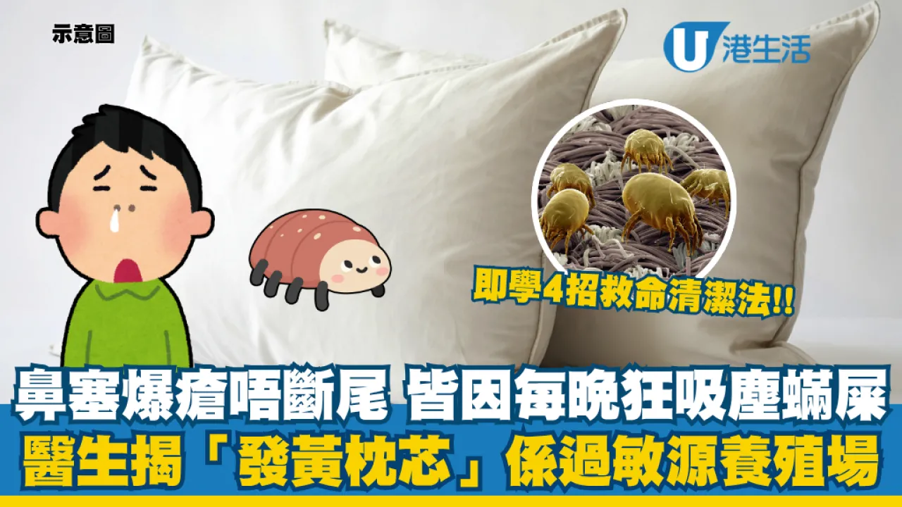 晚晚鼻塞爆瘡唔斷尾?醫生揭「發黃枕芯」如過敏源養殖場:每晚狂吸塵蟎屎!即學4招枕頭正確清潔法