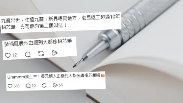 近日,有網民在 Threads 發文詢問大家對這款無需用刨、只要按壓就會出芯的鉛筆的稱呼。帖文意外揭露了一個隱藏多年的「香港語言結界」,大部份居住港島和九龍區的人士,由細到大都稱它做「鉛芯筆」;但在新界大西北(特別是元朗、天水圍、屯門,甚至北區),卻有大比例的街坊稱它為「撳芯筆」。