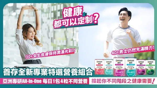 別以為年輕就有健康的本錢,30+男女及早攝取適合自己的營養,有助及早對抗衰老之餘,亦可為踏入下一個年齡段準備更好!善存專業特選營養組合($369/盒)專為30+系列︰女士30+含有兒茶素、黃芪,以及膠原蛋白、透明質酸再配合維他命C,支持皮膚、頭髮及指甲健康,有助提升女士光彩及氣色,令女生時刻保持年輕有活力!男士30+則以完整維他命B群維持充沛活力,結合鎂及維他命D支持肌肉功能,再以水飛薊、薑黃素、茶胺酸與南非醉茄為30+男士護肝兼紓壓放鬆,提升男士活力及紓壓!