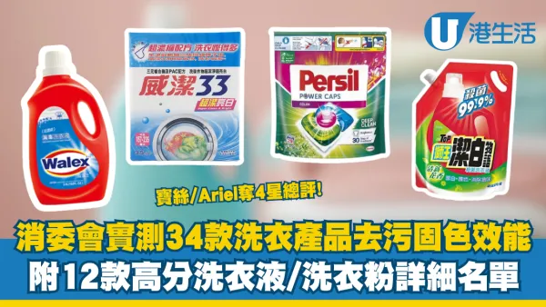 消委會曾測試市面上34款洗衣清潔劑,包括16款洗衣粉、15款洗衣液和3款洗衣膠囊,比較其去污效能、潔白度和固色程度。