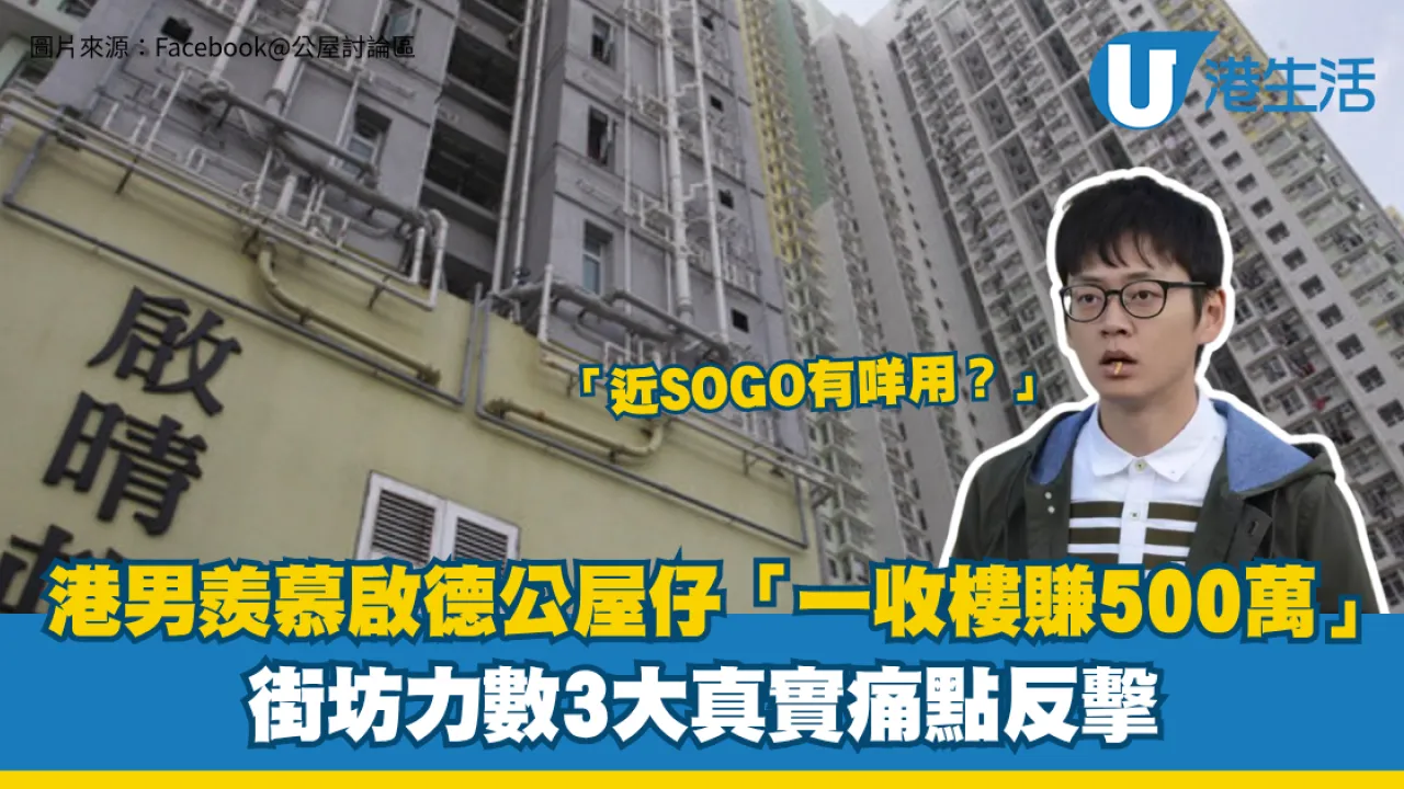 有港男在Facebook群組「公屋討論區」以「好羨慕啟德班公屋仔」為題,發帖羨慕獲派啟德發展區公屋的市民,並指他們「真係一收樓就賺500萬」,啟晴邨街坊更是步行1分鐘可達崇光百貨,更稱區內500米範圍內約有10個商場,配套「勁X到癲」,認同「得公屋得天下」!
